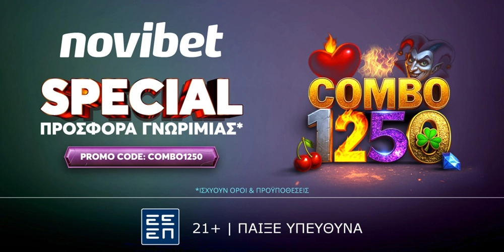 Εκτός από την SPECIAL προσφορά* COMBO1250 η οποία θα είναι διαθέσιμη στην πλατφόρμα της Novibet μέχρι τις 20 Ιουνίου στις 23:59, όποιος επιλέξει τη Novibet για την διασκέδασή του θα βρει 1000+ προσφερόμενες αγορές σε όλους τους αγώνες, ενώ τα μέλη του καζίνο μπορούν να βρουν μεγάλη γκάμα προσφορών*, Novibet Branded τραπέζια και κορυφαίο πρόγραμμα ανταμοιβής*.