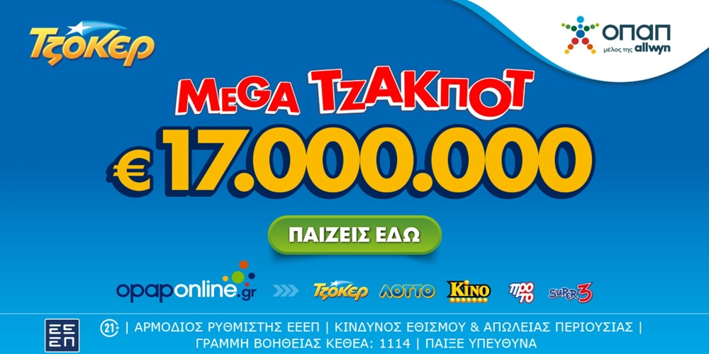 Το μεγάλο έπαθλο* της πρώτης κατηγορίας (€17.000.000), αλλά και το έπαθλο* των €100.000 στη δεύτερη κατηγορία, έχουν την ευκαιρία να διεκδικήσουν οι παίκτες του ΤΖΟΚΕΡ, συμμετέχοντας στην κλήρωση και διαδικτυακά, από όπου κι αν βρίσκονται, μέσω του opaponline.gr και του Opaponline App.