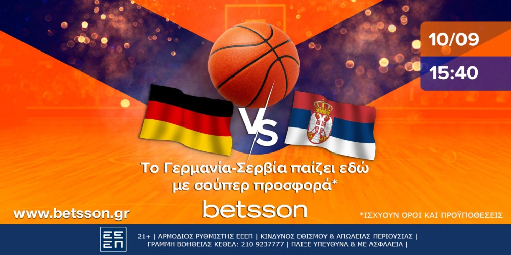 Ποια χώρα θα πάρει το Μουντομπάσκετ; Θα το ξέρουμε την Κυριακή. Μέχρι τότε όμως στην Betsson θα βρείτε μία σούπερ προσφορά* για το Γερμανία-Σερβία που θα τρέχει μέχρι και την έναρξη της αναμέτρησης!