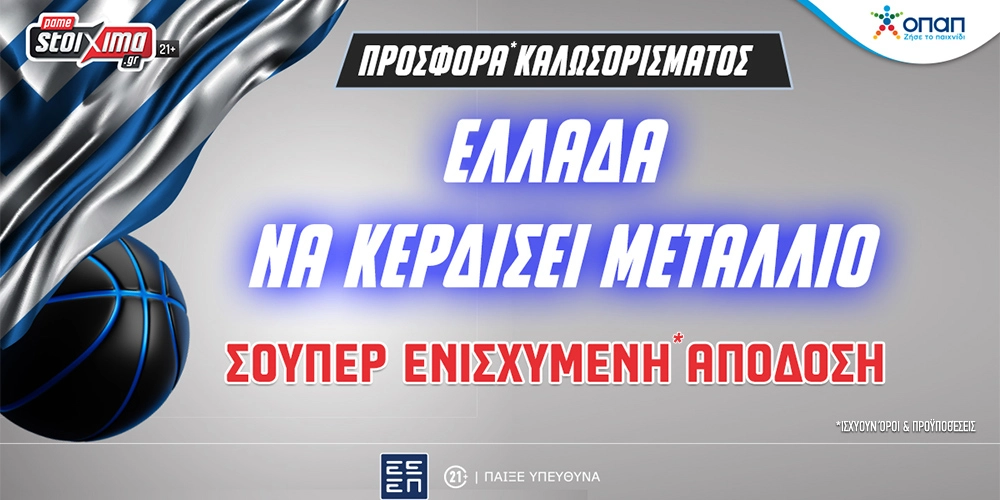 Μια μοναδική προσφορά* σε περιμένει στο Pamestoixima.gr. Μια αποκλειστική προσφορά* καλωσορίσματος στην κατάκτηση ενός μεταλλίου από την Εθνική Ομάδα Μπάσκετ!